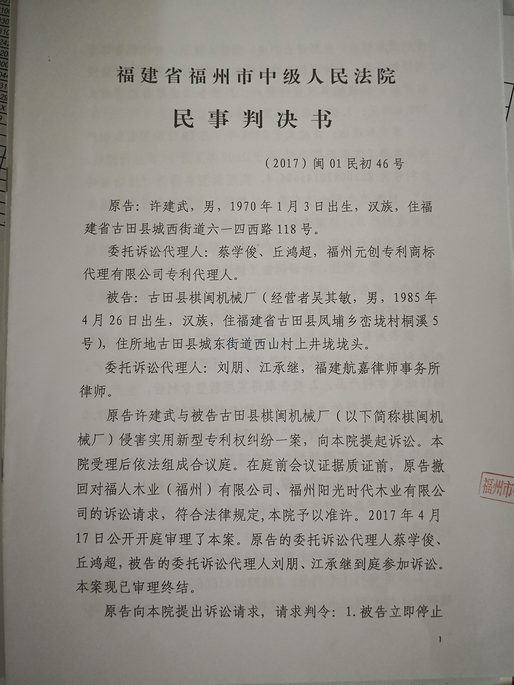 2018年,公司代理專利侵權訴訟案件((2016)閩01民初46號)入選“2017年福州中院十大知識產(chǎn)權案例”